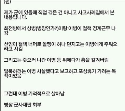 탈남이겠지. 와 저거 완전 개새ㄲ네... 진짜 일병 살아줘서고맙다..