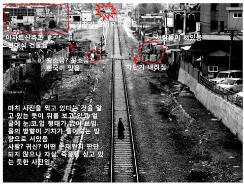 1.사진작가가 아주 멀리서 찍은 사진인데 여자가 정확히 카메라 렌즈를 바라보고 있음. 2.여자 얼굴이 없음 3.왼쪽은 옛날, 오른쪽은 현재 4.왼쪽 어딘가에 사람이 묻혀져 있음