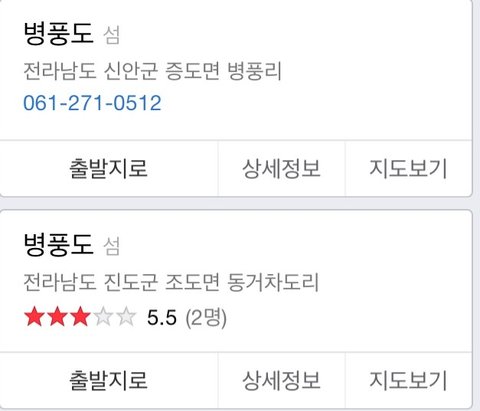 두 개의 병풍도가 검색됩니다. 신안군 병풍도와, 진도군 병풍도.