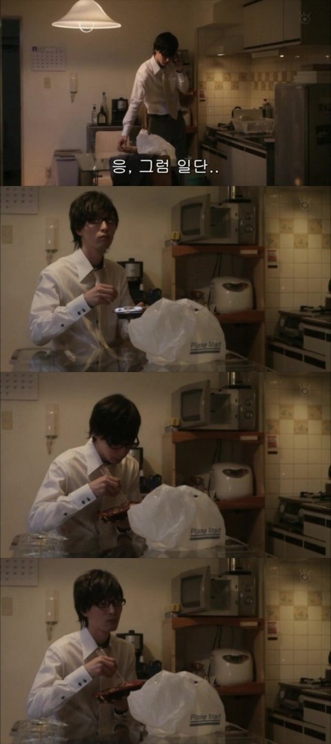 식사를 하려고 친구와의 전화를 끊고 남자는 식탁에 앉습니다