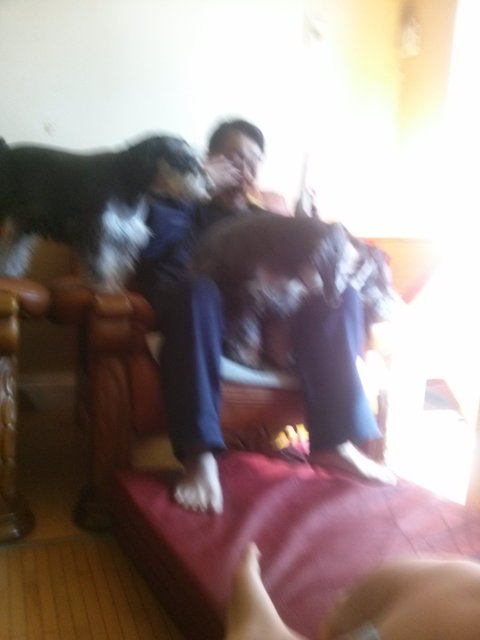 거실에 누워계신 아빠 다리에 자기다리 한짝 올리고 쳐다보는 구찌.