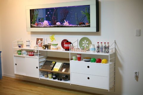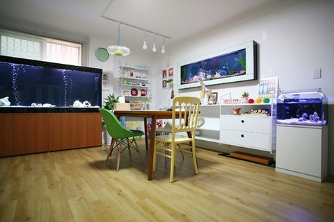 거실엔 원래 벽걸이수족관만 있었는데.. 해수어항 큰 대형어항 하나 더 들였습니다..