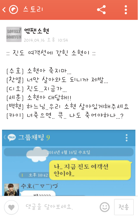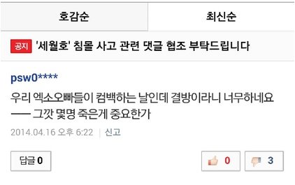 병신들이 그걸 빌미로 댓글에 엑소드립치고 그세월호 드립으로 카톡놀이하고자빠젔고 ㅋㅋㅋ