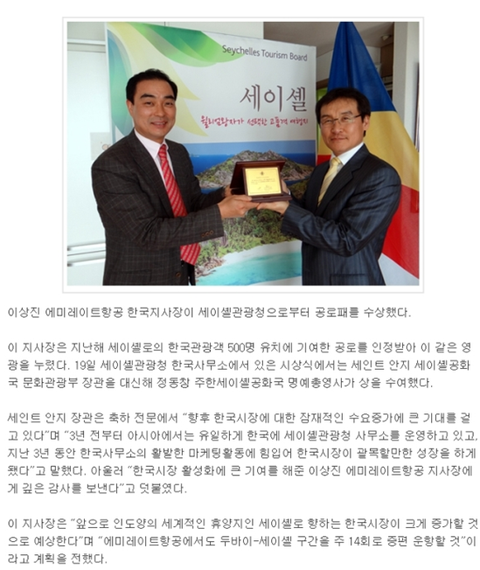 이상진 에미레이트항공 한국지사장 세이셸관광청 공로패 수상