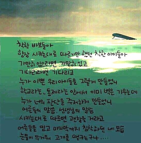 누군가 인터넷에 올린 이 시를 주목해 보세요 "누가 이쁜 우리 아이들을 그렇게 만들었니 학교라는.. 통제라는 안에서 이미 벽은 기우는데 누가 너의 판단을 주저하게 만들었니 어른들의 말씀 선생님의 말씀 시키는대로 따르면 괜찮을 거라고 어른들을 믿고 마지막까지 침착하던 네 모습"