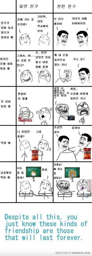여자인 내가 생각하는 진짜 친한친구는 헤어질때 넘치지도 덜하지도않은 '들어가','가' 이정도의 무심한 한마디면 충분하고, 빌린돈은 친구가 말꺼내기전에 알아서주면되고 빌려준돈은 친구가 주기전까지 말한마디도 꺼내지않는다. 옷을갈아입을때는 옷을갈아입고있지않을때와 다를게없고 먹을게있으면 니꺼내꺼없이 허락따위없이 '먹을게 있으니까 먹어야지' 이정도? 먹을거에는 조금더 설명을 붙이자면 (먹는건 중요하니까)먹을거주인은 친구가 먹어도되냐고 묻기전에 뜯어놓고 묻지말고먹어 라는분위기가 저절로생긴다. 학교서는 아무렇지도않게 같이먹다걸려서 혼남 걍 10년친구랑 나는 이렇게지냄