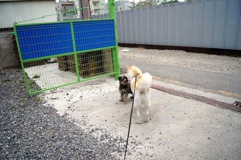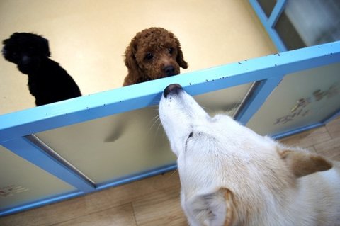 ㅋㅋ울타리 너머로 푸들 친구와 인사하고 있어요 킁킁