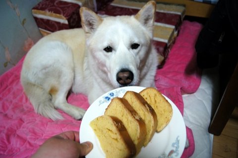 간식 달라고 손 주고 있는 심바 뒤로 백구가 다가왔어요