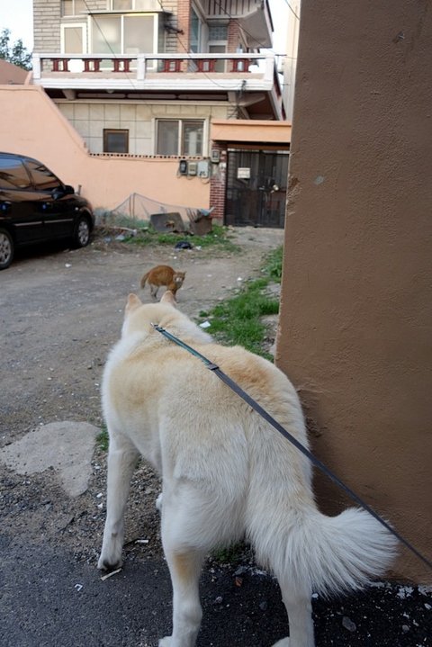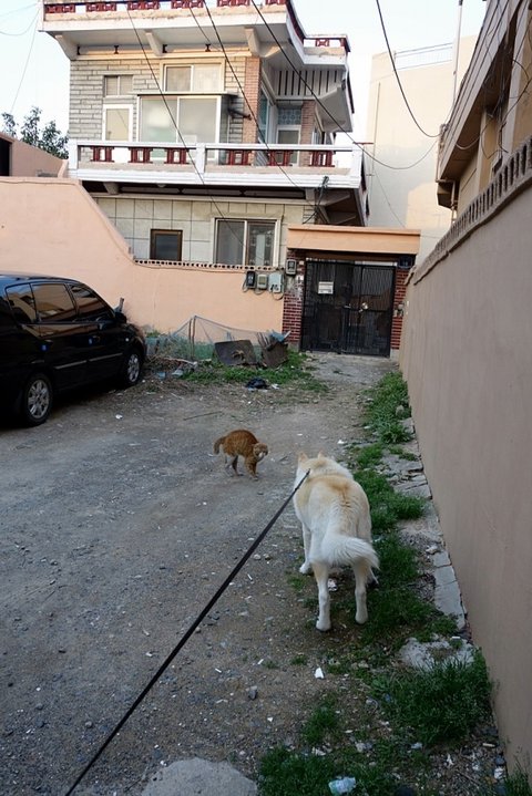 ㅋㅋ 노랑 고양이와 만났어요. 심바보고 엄청 경계하네요.