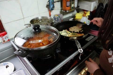 어머니 생신날인데. 동생이 파전도 하고 묵은지 찜도 하고 요리하고 있어요