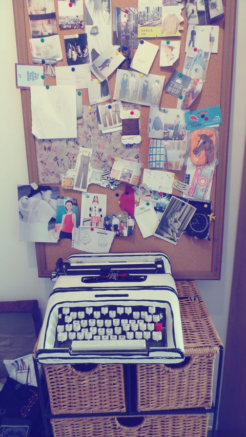 책장옆에 타자기도 너무 귀엽구, 우드 보드엔 그림과 사진들이 붙어있었는데