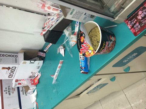 들어가자마자 컵라면통, 젓가락쓰레기, 얼룩들이