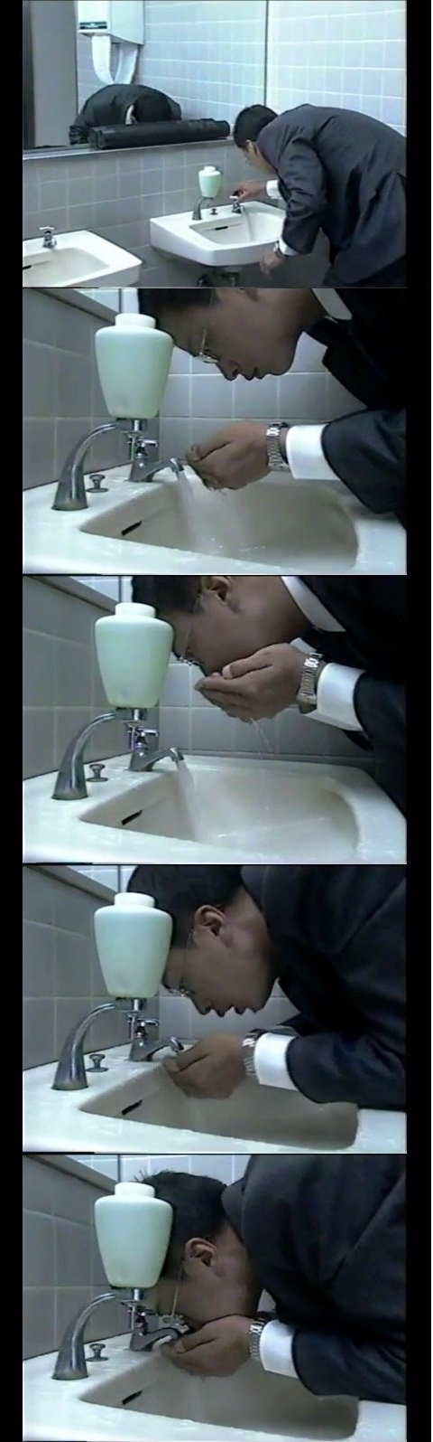 남주의 눈은 직원이 손씻는 모습 아니, 정확히는 세면대에서 쏟아지는 물에 고정됨.