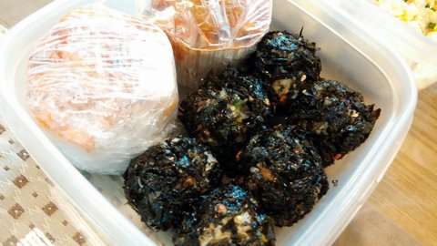폭탄 주먹밥이에요 ! 옆에는 김치새지말라구 ㅋㅋㅋㅋㅋㅋㅋㅋㅋ