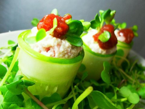 두부를 햄을 다져서 뭉치고 오이로 감싼 샐러드에요 봄나물로 데코ㅎㅎ