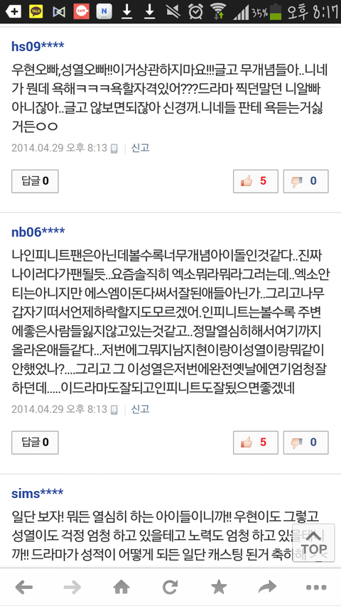 내가아까 네이버기사에 인피니트 반올림같은거찍는다는 기사를봤었거든ㅋㅋㄱ 근데거기에 일반인들이 아이돌들 연기쫌시키지말라는 그런댓글들이 대부분이였어 그래서 그런가보다하고 다른기사들보다가 다시들어가보니까 엑소도하는데 왜인피니트는안되냐 이런댓글들이 많더라고ㅋㅋㅋ 그래서 그냥 코웃음치고 폰끄고공부하다가 방금 기사들보다가 신경쓰여서 다시들어갔는데 이게무슨ㅋㅋㅋㅋ 아까 인피니트까던 사람들을 전부엑소팬들로만들고 개까고있음ㅋㅋㅋㅋㅋ