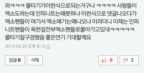 사람들이 인피니트욕함>인스피릿들 엑소도하는데 우리인피니트는왜안돼냐>엑소팬들 여기서 엑소얘기는또왜나오냐>인스피릿들 엑소팬들 끌어들이기 성공 모든잘못 엓팬들에게 뒤집어씌움