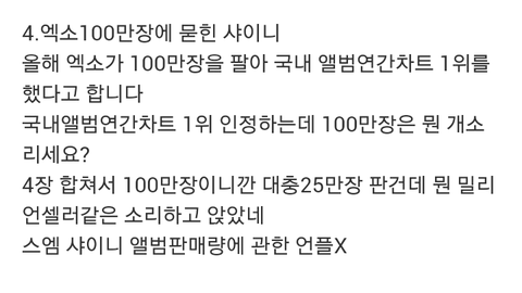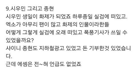 이거진심 존웃ㅋㅋㅋ스엠이 왜 언급해;;그리고 시우민 실검오래뜬게 화력때문이지 또 실검뜨니깐 기사가 쓰이는거지ㅋㅋㅋ