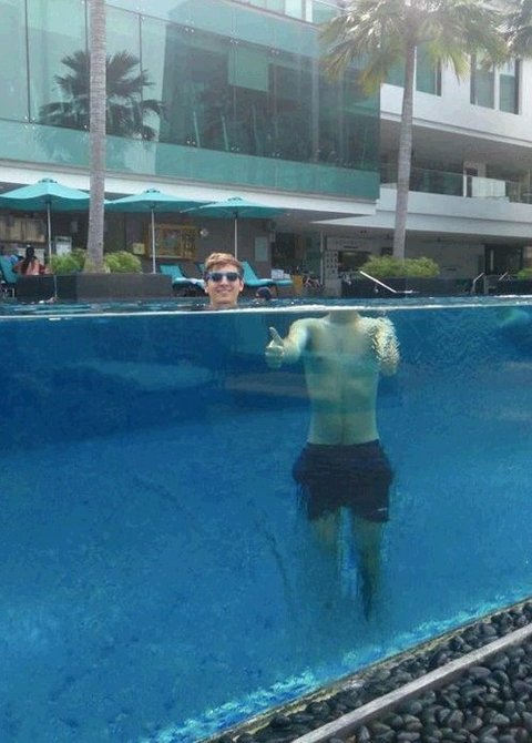 물과 유리가 이중으로 굴절을 일으켜서 머리와 몸이 분리된 듯한 착시를 준다고 함;