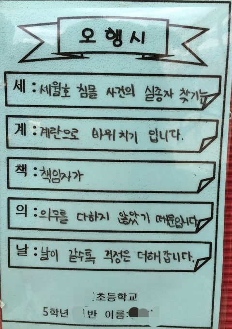 초등5학년의 세월호 관련 오행시
