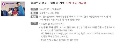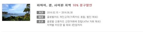 하와이, 괌, 사이판 지역 어디든지 할인 10%! 캐시백 해준다고 하네요!