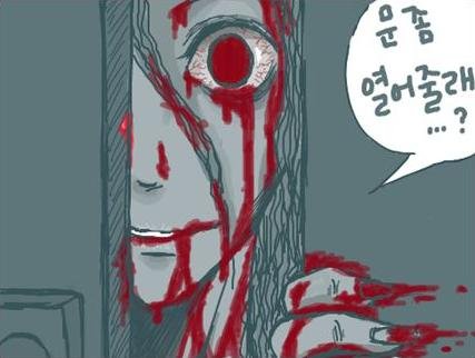갑자기 방문이 쿵!!!!하면서 열어줄레?열어!!열어!!!하면서 쿵쿵 거린다고 한다 문이 부셔질정도로.......