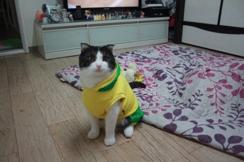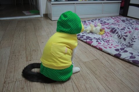 유청이는 옷에는 관심이 없네요. 간식이나 챙겨 줘야겠어요.