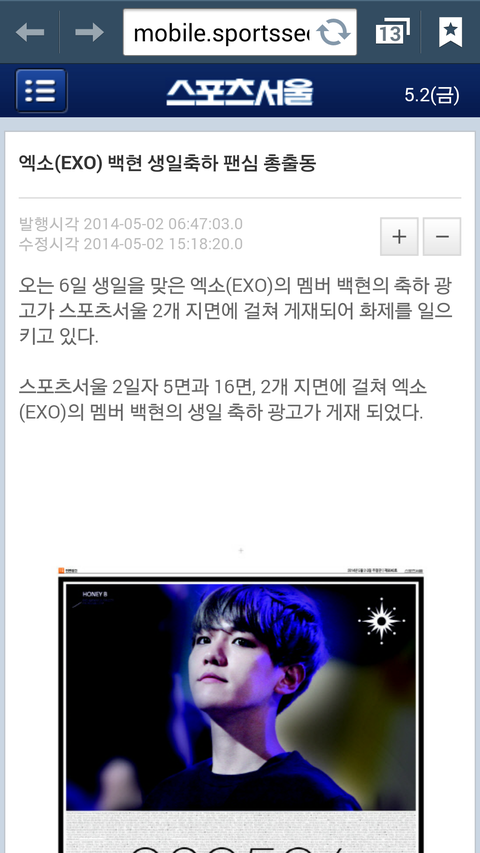 이 사실을 확인한 엑소(EXO)의 한 팬은 ”신문에 한면만 나가도 팬들에게는 고맙고 환영할 일인데 두 면 씩이나 백현의 생일을 위해 광고가 나간다는 것은 팬에게 무한한 자부심을 느낀다. 더욱 스타를 향한 바른 팬심을 보일수 있도록 노력 하겠다”고 말하며, 또 다른 엑소(EXO)의 팬들은 ”5월 2일자 스포츠서울 꼭 겟(get) 하겠어”, ”다음 생일을 맞을 엑소(EXO)멤버는 스포츠서울 광고 지면 전체를 생일 축하로 채우는거 아니냐” 등의 반응을 보였다.