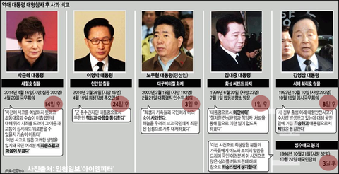 박근혜 대통령의 세월호 사고 관련 사과는 역대 대통령들의 대형참사 사과 중 MB를 제외하고는 가장 늦었습니다. 김영삼 대통령은 '성수대교 붕괴 사고' 관련 사과를 사고 발생 3일 후에, 서해훼리호 당시는 8일 후였습니다. 김대중 대통령은 '화성씨랜드 화재' 사고가 난 바로 다음 날 사과를 했습니다.