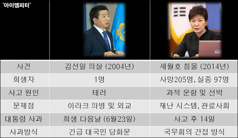 노무현 대통령은 '대구지하철 화재' 사고가 나자 대통령이 아닌 당선인 신분에도 3일 후에 사과했습니다. 박근혜 대통령의 세월호 사과는 MB의 천안함 사과에 비하면 빨랐지만, 순수 대형참사로 본다면 가장 늦었다고 볼 수 있습니다.