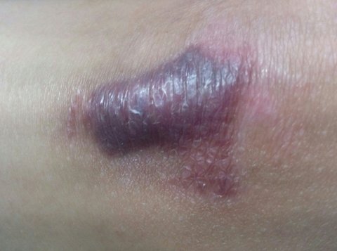 다친지 2달이지났는데 상처가 아물고 난 뒤 보라색으로 변한 상태에서 변화가 없습니다