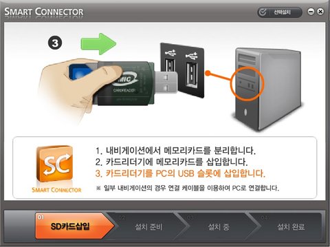 SD카드의 컴퓨터 연결은 본체에 내장SD리더기가 있으면 직접 연결을 하고, USB연결 부분만 있다면 별도의 USB타입 SD카드리더기를 사용하여 컴퓨터에 연결을 하면 됨니다.