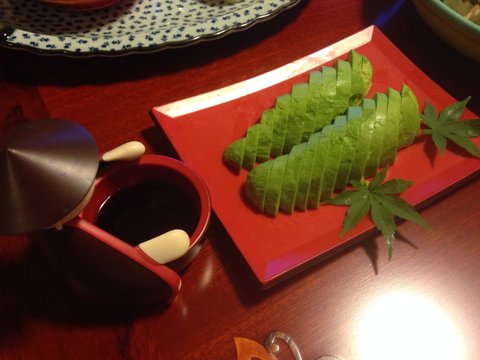 아보카도 사시미~~ 과일 아보카도~~ 지방이 많아 이렇게 사시미(회) 로 먹어도 참치 뱃살처럼 맛나다.