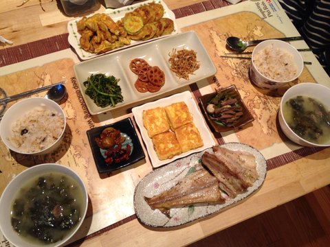 아내 생일상~~ 직접한 반찬(소고기 장조림,연근조림, 비름나물) 생물 임연수구이, 소고기 들깨 미역국, 버섯,호박전, 두부부침.