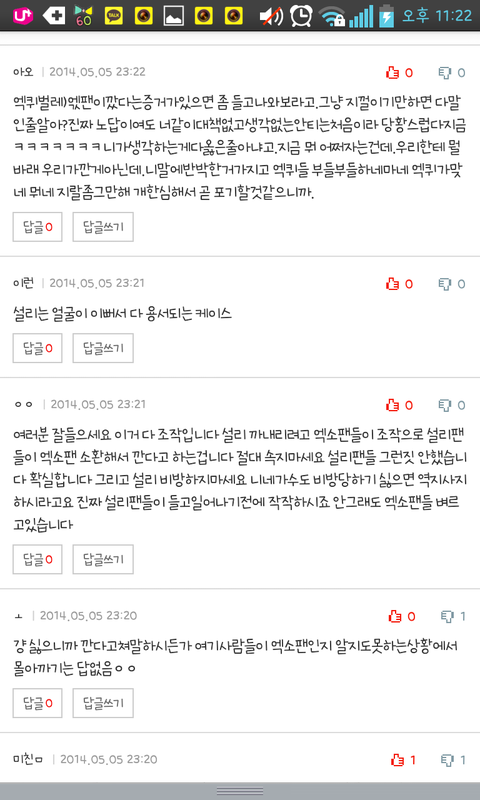 지금 엔터톡에서 설리까는 베플이 다 엑소팬이고 오세훈 춤못추는데 안깐다고 물타기중 ㅋㅋㅋㅋㅋㅋㅋㅋㅋㅋㅋㅋㅋㅋㅋ시발 진짜 미친년들아니냐 우리가 동네북신세인것도 한두번이지 시발 진짜 제대로 돌은년들임 ㄹㅇ;;;;; 톡선글인데 진짜 시발 좃같은년들;;;;;;