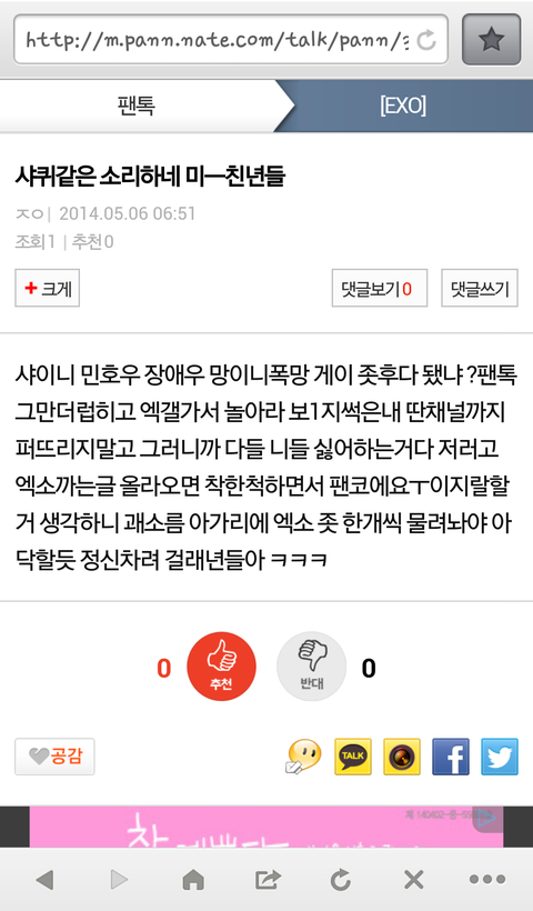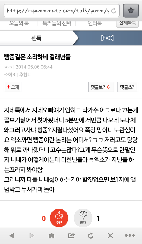 저희도요 물론 심하긴 했지만 패드립,인신모욕,성드립 장난 아니더라구요 분명 상황 모르시고 그냥 흘겨 보내시는 샤월분들은 또 타팬이 팬코한거다 하시겠지만 글의 상황을 보면 저 ㅈㅇ라는 닉네임 가진 사람이 계속 분탕 친게 보였습니다 화나네요