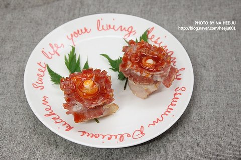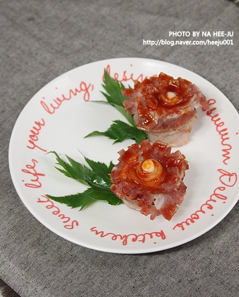 그 주위에 자른 베이컨을 꽃잎처럼 덧대어서 감싸면 카네이션 모양을 잡을 수가 있다고 한다.