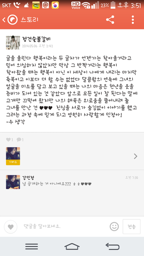 직장동료와 만나는 자리에서 우연히 동료 남편 동료들과 술한잔을 했다고합니다 그날 하루본 사람이 카스에 아래와 같이 글을 남겼는데 사진의 내용이 처음본사람이 남긴 글같습니까?처음본 사람들과 카스를 주고 받습니까?가정이 있는주부가...이 남자와 처음만난 사람이 맞을까요?여러분들의 생각을 듣고싶습니다