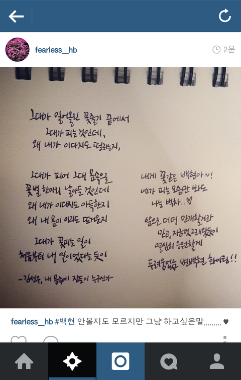 백현이인스타 글 fearless 자나 근데 나 태그그냥백현 쳐서 사진들구경하다가 시 있길래들어가서 읽다가 오 멋있다하고 아이디봤는데