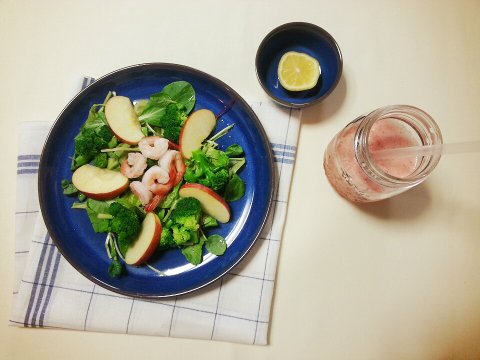 브로콜리랑 사과 그리고 칵테일 새우 얹고