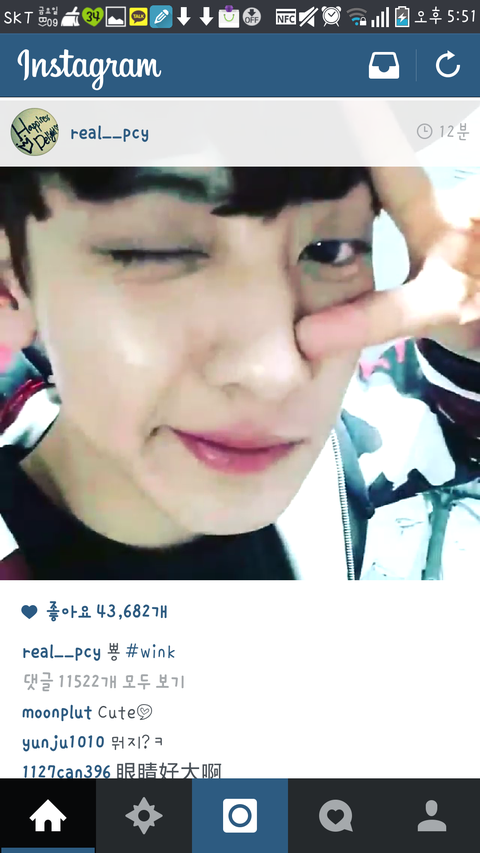 찬열이 인스타 윙크사진 캡쳐함
