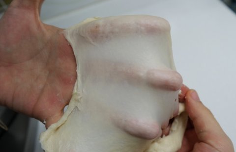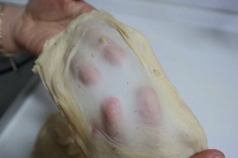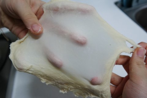 반죽을 약간 떼어 늘려봤을 때, 반죽이 찢어지지않고 반대편이 투명하게 비치면 잘 된 반죽이에요!