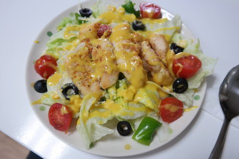 닭가슴살 튀겨낸 머스터드드레싱 올린 샐러드와