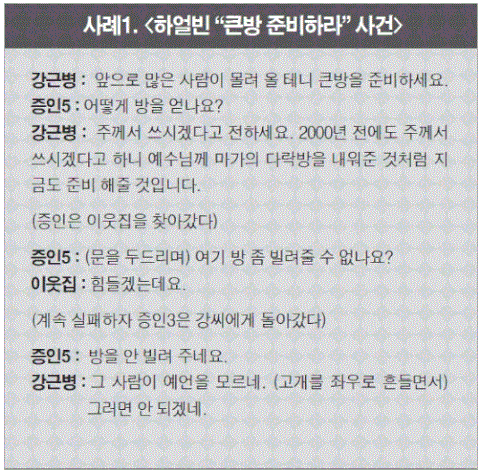 http://www.112news.co.kr/news/content.asp?fs=2&ss=7&news_idx=201405082344102781 법무경찰신문재산 갈취, 시한부 종말론에 대한 다양한 증언이 속출했지만 강씨가 주장한 ‘하얼빈 선언’에는 “3일 만에 천국 간다” “전 재산을 가져오라”고 말한 기록은 없다. 지탄거리가 될 수 있는 상황들을 의도적으로 뺀 게 아닌가 의심이 가는 대목이다. 강씨는 그날 “자신의 집에 남아 있어야 천국에 입성할 수 있다”며 일체 외출이나 개인적 행동을 통제했다.