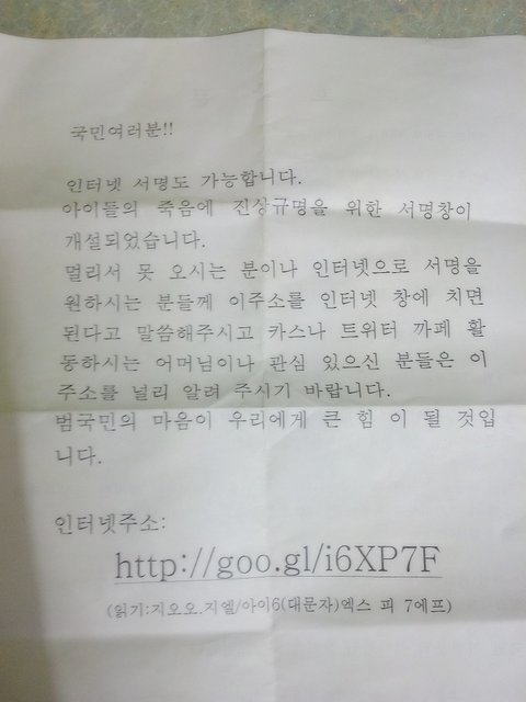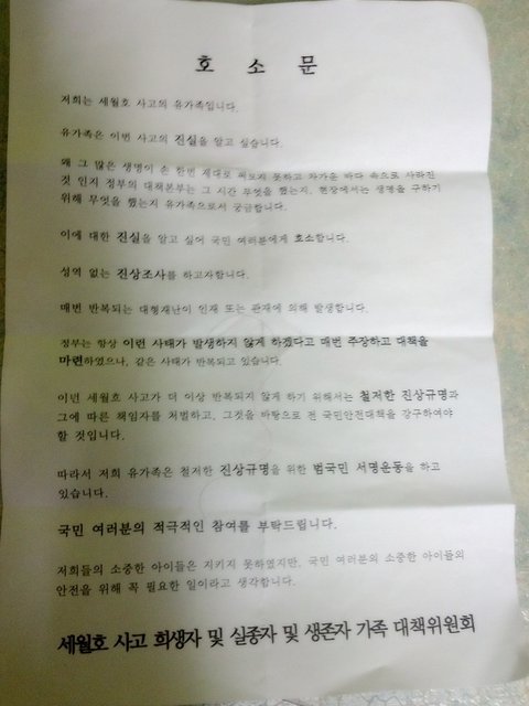 안녕하세요전 이번 세월호 사건 희생자들과 동갑인 18살고등학생입니다. 전 11일 안산 임시 분향소를 다녀왔습니다.그곳에서 세월호의 진실을 밝히고자 유가족분들과생존자 가족 분들이 서명운동을 벌이 고있습니다. 이 호소문을 보고 그냥 지나칠 수 없어 글을씁니다. 부디 이 글을 그냥 지나치시지 마시고 서명해주시길바랍니다.