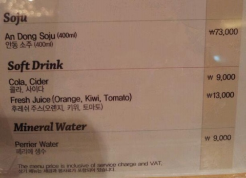 고급 호텔 음료 가격표