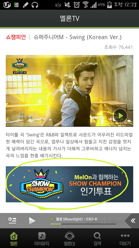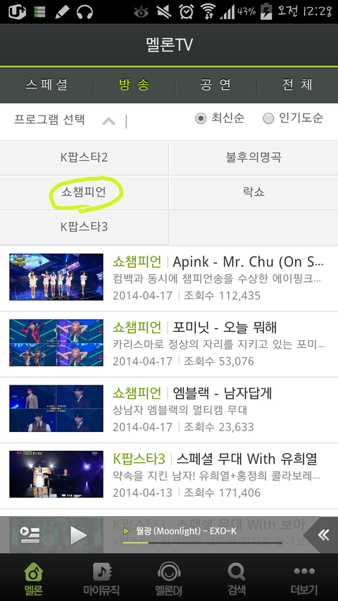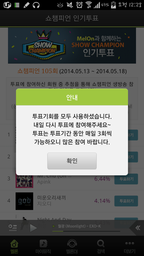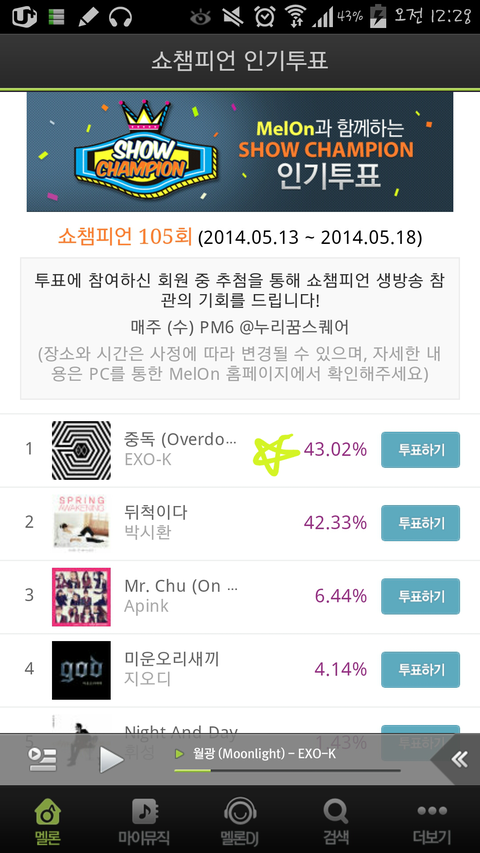 네번째에 엑스친 무대들어가면 쇼챔투표 안나오니까 슈주무대나 그 아래무대 들어가서 꼭하자 지금 2위랑 별차이 안나거든? 그니까 귀찮아도 하루세번 까먹지말고 꼭!