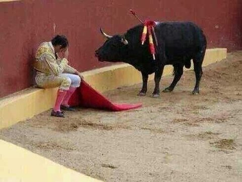 이 사진 유명한 거다. 경기 도중 소를 아무리 공격해도 소가 흥분하지 않고 오히려 천진하고 애원하는 눈으로 투우사를 쳐다보자 양심을 가책을 느낀 투우사는 바로 이 경기장을 나가 투우반대운동을 벌인다. 이 사진은 그 소의 눈빛으로 인해 좌절한 투우사의 모습. torrero alvero munero.