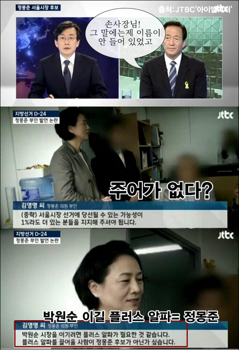 정몽준 의원은 새누리당 서울시장 경선이 끝난 뒤에 JTBC 손석희 앵커와 인터뷰를 했습니다. 이날 손석희 앵커가 부인 김영명 씨의 선거법 위반을 묻자 정몽준 의원은 ' 본선에서 이길 수 있는 후보를 지지해달라고 말한 것인데, 그 말에는 제 이름이 안 들어 있었다'고 대답하기도 했습니다.