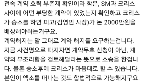 크리스가 승소하면 본인이 원할경우 엑소 탈퇴할수 있다는거임 탈퇴 안하겠다하면 그냥 계약만 수정하고 남아있는거고ㅇㅇ